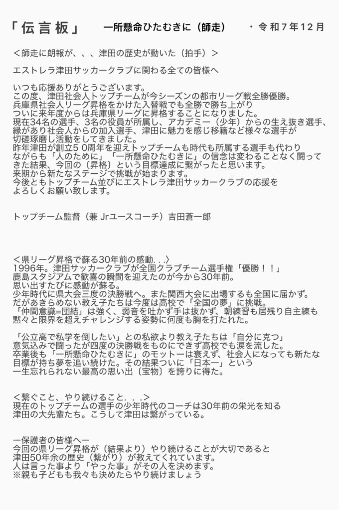 エストレラ津田サッカークラブに関わる全ての皆様へ